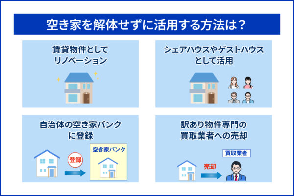ここからは、空き家を解体せずに活用する方法について解説しますので、空き家の解体を決断する前に、建物を活かした活用方法も検討してみましょう。